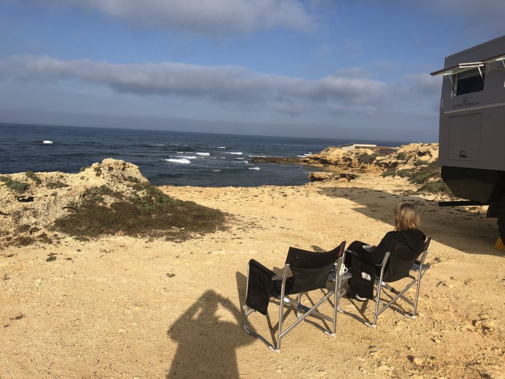 Am Abend geniessen wir den sensationellen Blick hinaus aufs Meer und die untergehende Sonne. Vor uns in der Ferne liegt die Hauptroute der Containerschiffe, die durch den Suezkanal fahren.