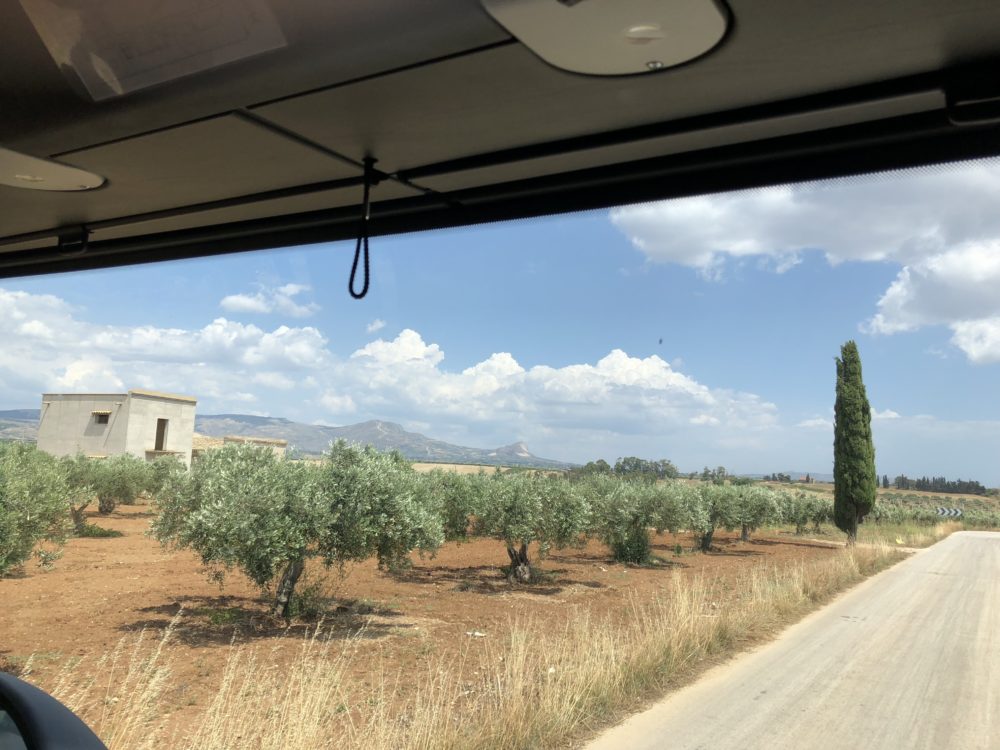 Morgen wollen wir Siracusa besichtigen. Wir finden in einem Agricampeggio unter Olivenbäumen in der Nähe einen schönen Platz zum Bleiben. Mit unseren Bicis fahren wir am Morgen früh nach Siracusa. Die Strasse ist höllisch befahren und für Velofahrer gar kein Spass! Es wird sehr schnell und sehr nahe überholt und teilweise einfach rausgefahren, so dass wir stark abbremsen müssen. Als Velofahrer bist du offenbar kein gleichberechtigter Verkehrsteilnehmer! Mit unserem Sport – Modus haben wir die Höllenfahrt dann mit Angstschweiss auf der Stirne hinter uns gebracht.